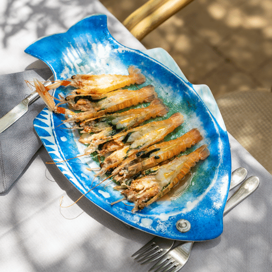 Potrete gustare i dentici e le orate di Arbatax in crosta di sale, o ancora i gamberoni di Capo Carbonara alla piastra impreziositi con un filo d’olio biologico ogliastrino.